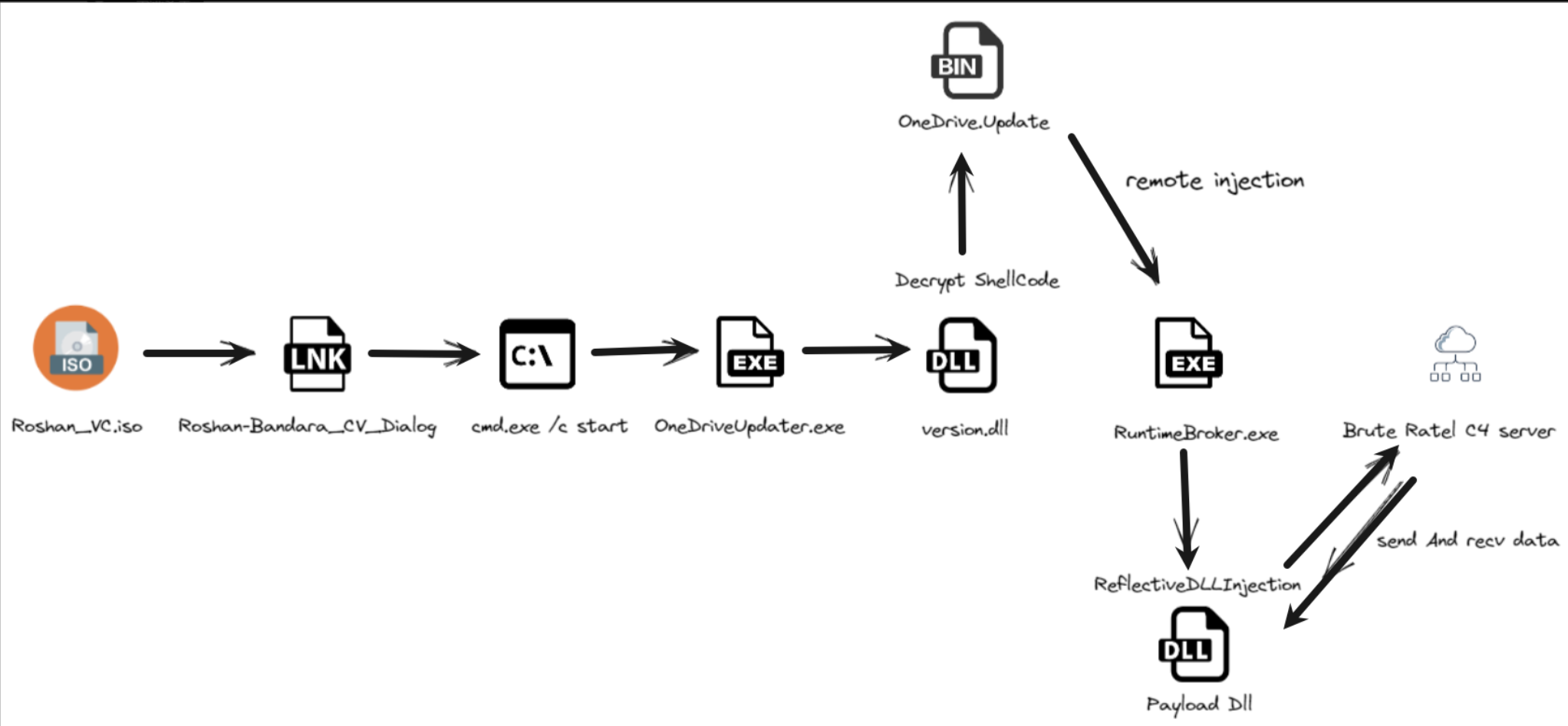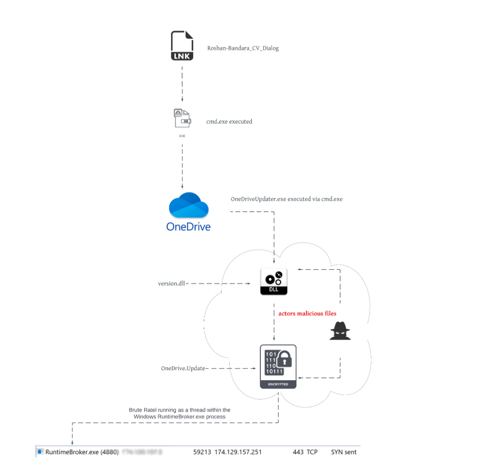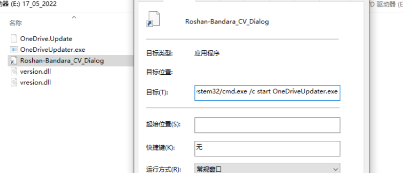 我们查看Roshan-Bandara_CV_Dialog快捷方式指向的目标%windir%/system32/cmd.exe /c start OneDriveUpdater.exe,主要就是调用cmd命令执行了隐藏文件OneDriveUpdater.exe,cmd.exe /c命令指定执行完后会自动关闭控制台窗口