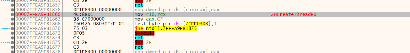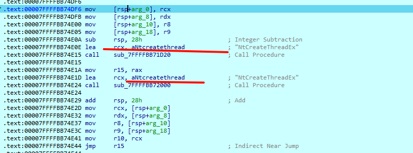 调用NtCreateThreadEx启动线程代码,如下所示