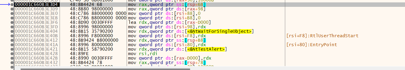 这意味着任何在用户模式下或通过内核回调/ETW挂接LoadLibrary的EDR都可以检查最后一个返回地址区域或调用的来源。在BRc 4的v1.1版本中,我开始使用RtlRegisterWaitAPI,它可以请求线程池中的工作线程在单独的线程中执行LoadLibraryA来加载库。一旦库被加载,我们可以通过简单地遍历PEB(进程环境块)来提取其基址。Nighthawk后来将此技术应用于RtlWorkItemAPI,它是WorkUserWorkItem背后的主要NTAPI,也可以将请求排队到工作线程以加载具有干净堆栈的库。然而,Proofpoint在去年的某个时候在他们的博客中对此进行了研究,最近Elastic的Joe Desimone也发布了一条关于BRc 4使用的RtlRegisterWaitAPI的推文。 这意味着迟早会被检测到,并且需要更多这样的API来进一步规避。因此,我决定花一些时间从ntdll中反转一些未文档化的API,并发现至少有27个不同的回调,只要稍加调整和黑客攻击,就可以利用它们来加载我们的DLL。