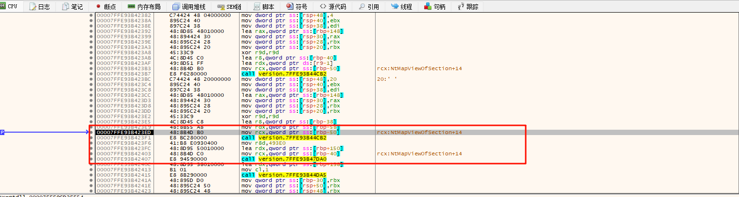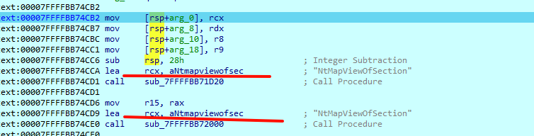接着调用NtMapViewOfSection函数将section映射到本进程虚拟内存