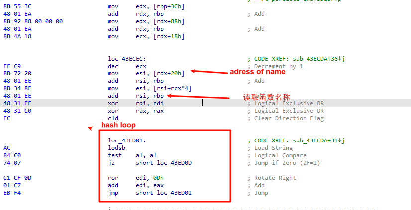 需要调用api都是通过hash算法获取API的名称然后进行调用的 (加密与解密P557),这样可以提升逆向分析难度,也可以缩小shellcode的体积