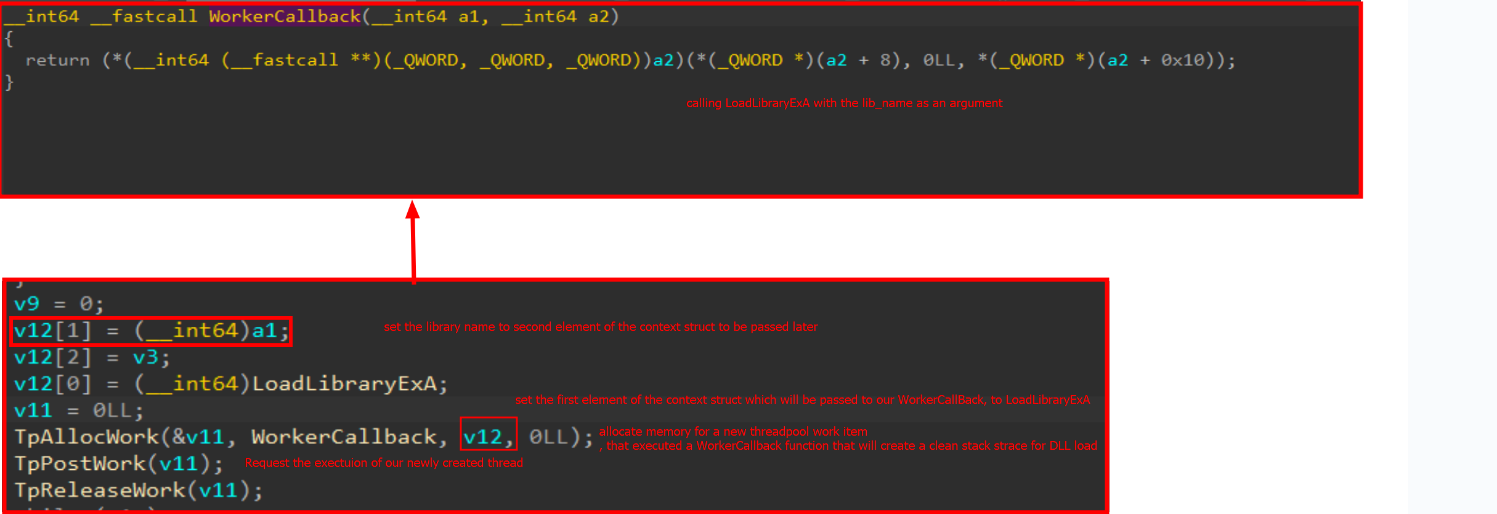 下面是项目源代码:TpPostWork调用WorkCallback,但WorkCallback不调用LoadLibraryA,而是跳转到它的指针。WorkCallback简单地将RDX寄存器中的库名称移动到RCX,擦除RDX,从adhoc函数获取LoadLibraryA的地址,然后跳转到LoadLibraryA,这最终重新排列整个堆栈帧,而不添加我们的返回地址。