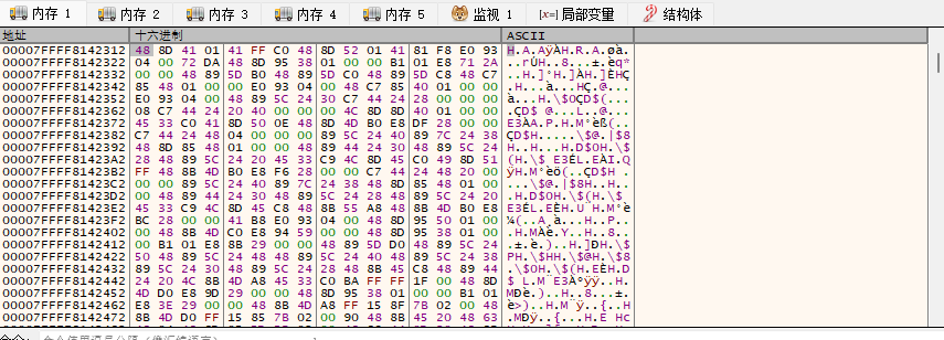 查看rsp寄存器内存,可以发现压入栈中的众多数据包含了一个PE文件并且此PE文件的Dos头的MZSignature被抹除防止EDR进行内存扫描查杀,