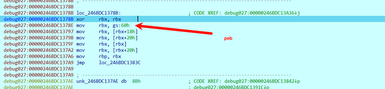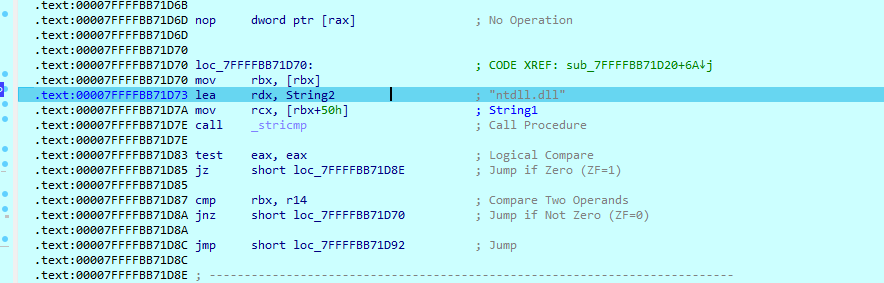 接下来的逻辑还是熟悉的通过PEB-Ldr->InMemoryOrderModuleList获取ntdll.dll的基址