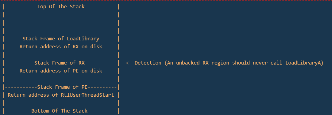 LoadLibraryA或LdrLoadDll将dll从磁盘加载到内存中。如果你的EDR使用userland钩子,它们可能已经钩住了LoadLibrary和LdrLoadDll,在这种情况下,它们可以检查由RX shellcode区域压入堆栈的返回地址。这是特定于一些EDR像哨兵一号,Crowdstrike等,这将立即杀死你的有效载荷。 其他EDR,如Microsoft Defender ATP(MDATP),Elastic,FortiEDR将使用ETW或内核回调来检查LoadLibrary调用的来源。堆栈跟踪将提供返回地址的完整堆栈帧以及从那里开始调用LoadLibrary的所有函数。 简而言之,如果你执行一个DLL Sideload,它执行你的shellcode,调用LoadLibrary,它看起来像这样: